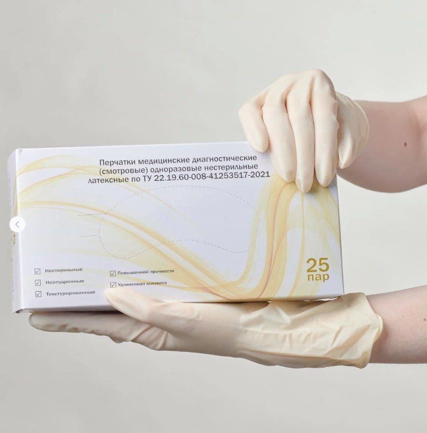 вариант исполнения 6: Перчатки медицинские диагностические (смотровые) одноразовые нестерильные латексные, неопудренные с полимерным покрытием, текстурированные, повышенной прочности с удлиненной манжетой