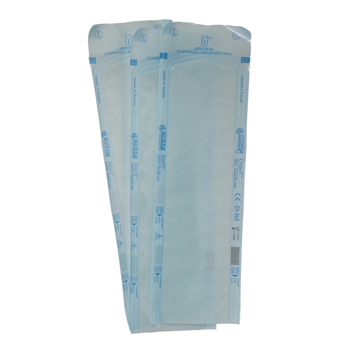 Пакет представляет собой комбинацию белой водоотталкивающей медицинской бумаги проницаемой для соответствующих стерилизующих средств и непроницаемой для