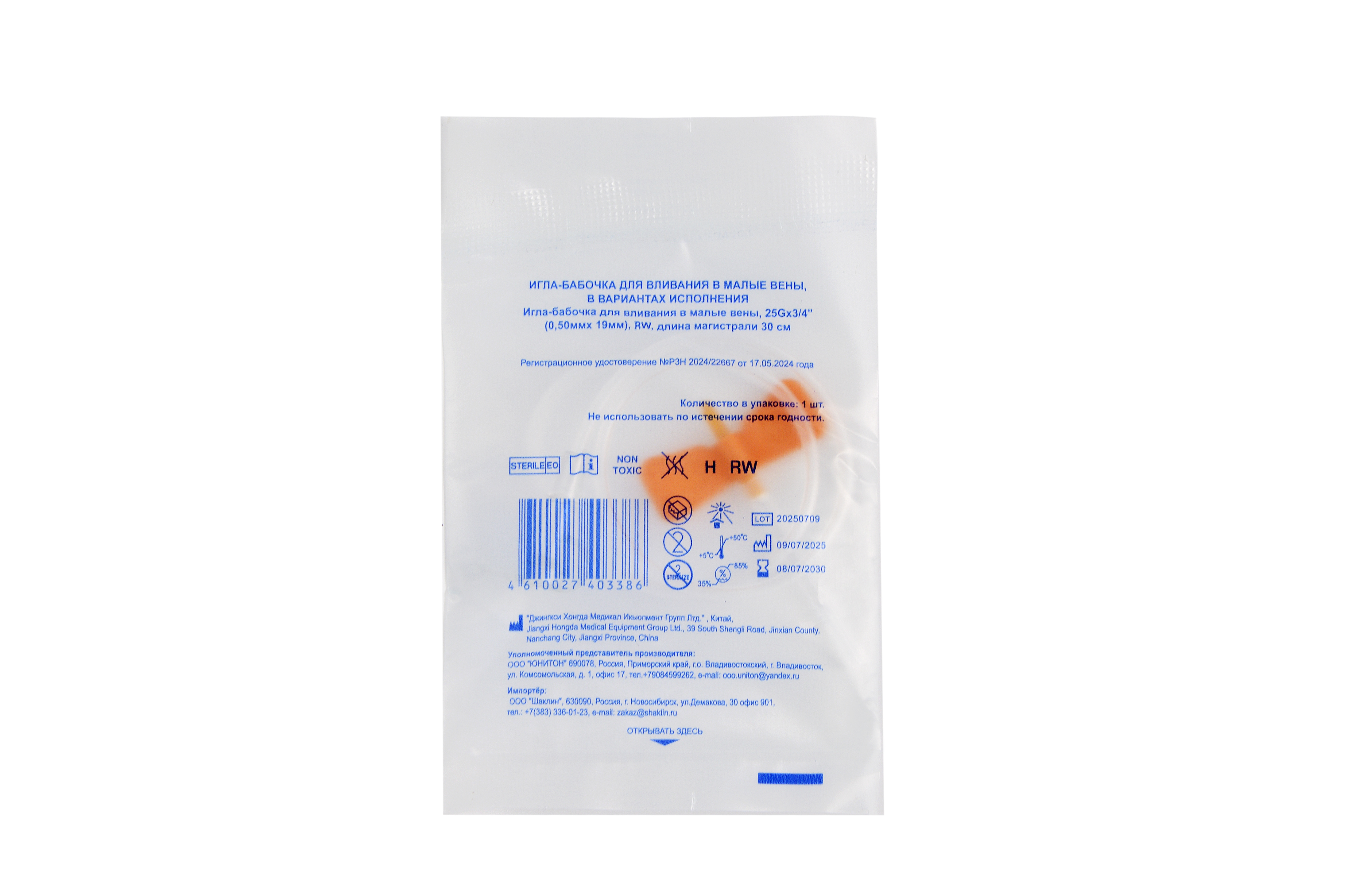 длина иглы 19(+1/-2) мм, длина магистрали 300(+/-15) мм. Размер: 25G (0,5*19мм), цвет оранжевый.