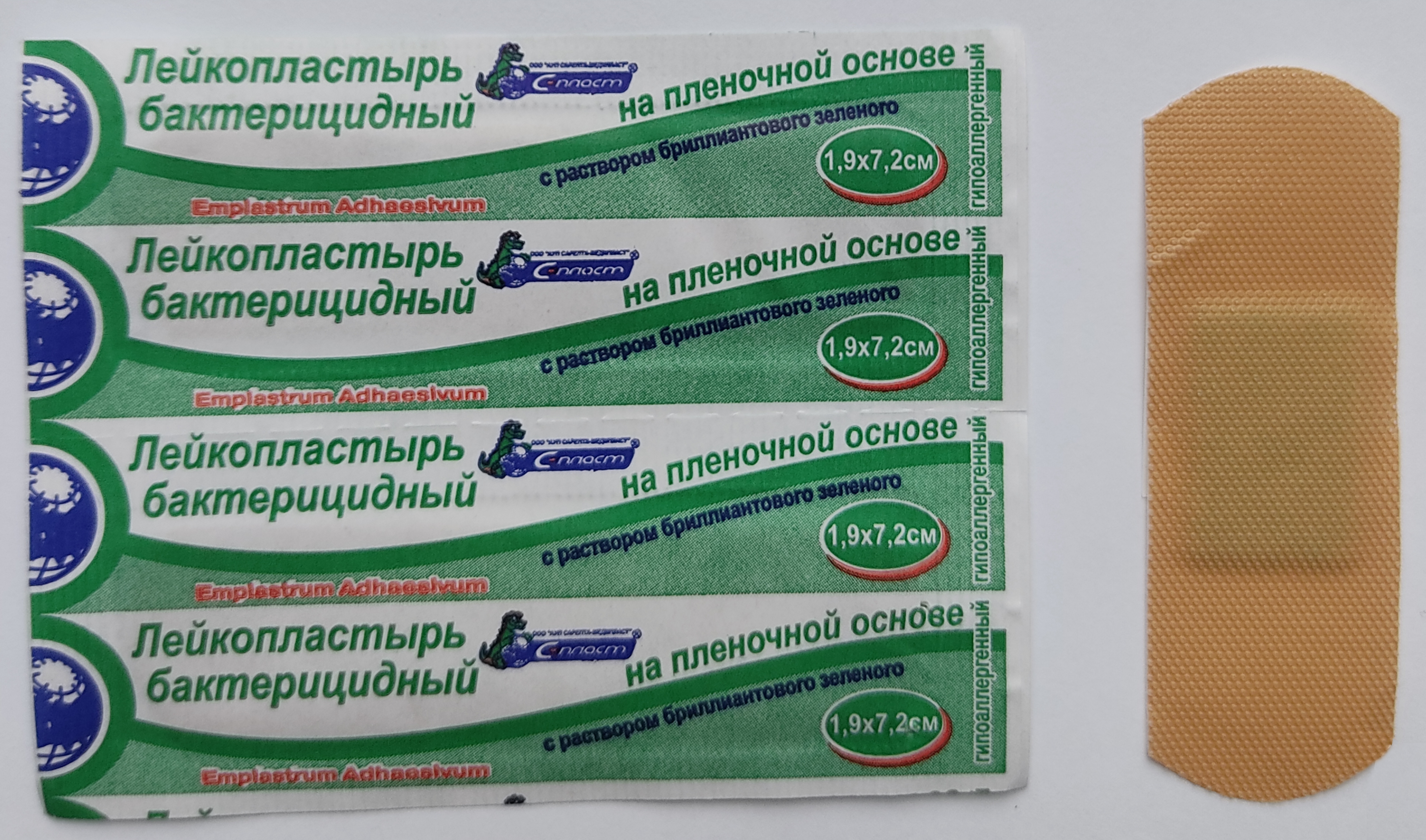 Лейкопластырь на основе микроперфорированной полимерной пленки телесного цвета . С внутренней стороны расположена раневая подушечка, пропитанная антисептичесим веществом - раствором бриллиантового зеленого, оказывающего обеззараживающее действие при соприкосновении с раной.