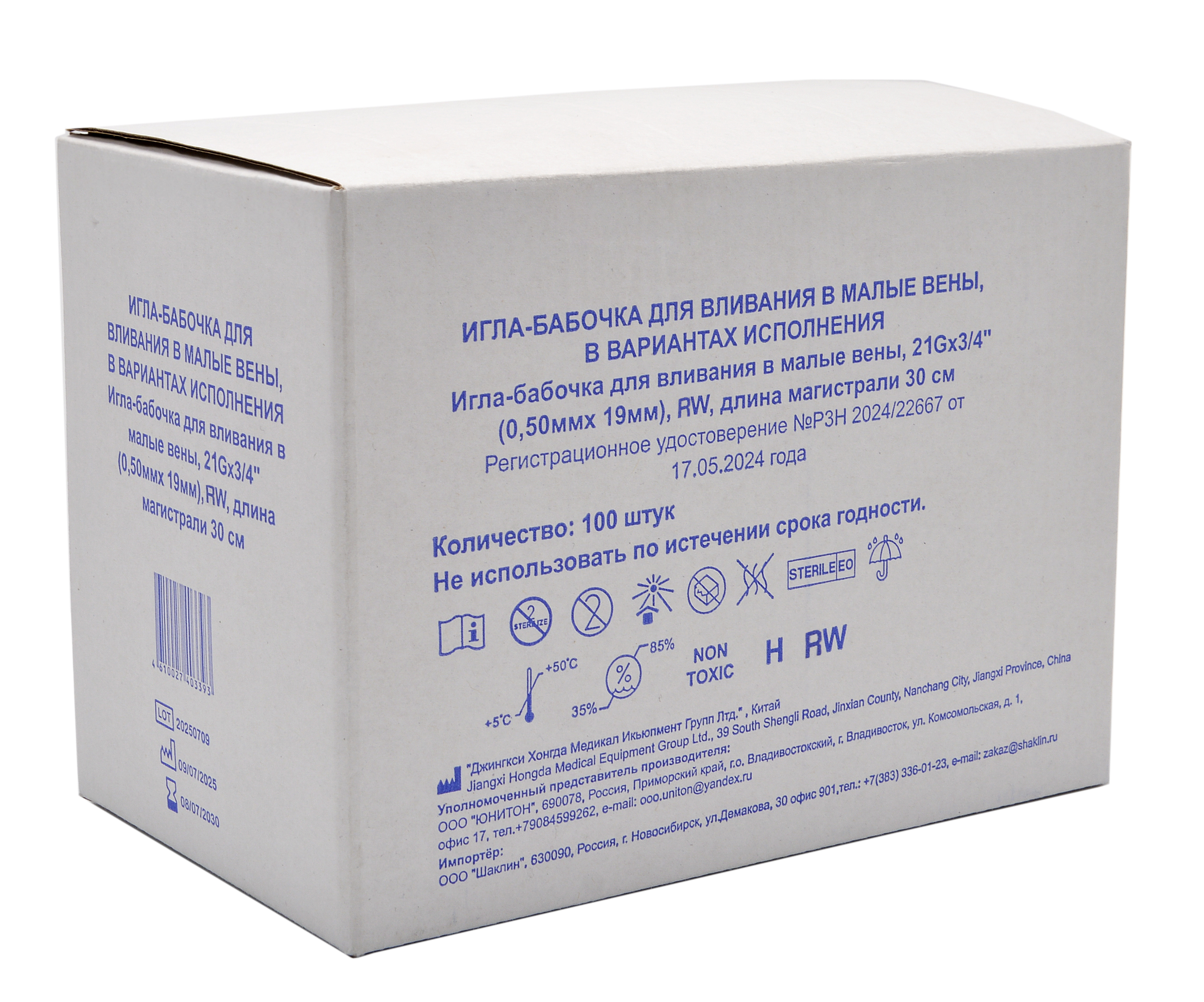 Игла-бабочка для вливания в малые вены, 21Gx3/4' (0,80мм×19мм), TW, длина магистрали 30 см- 100 шт. /в групповой упаковке;