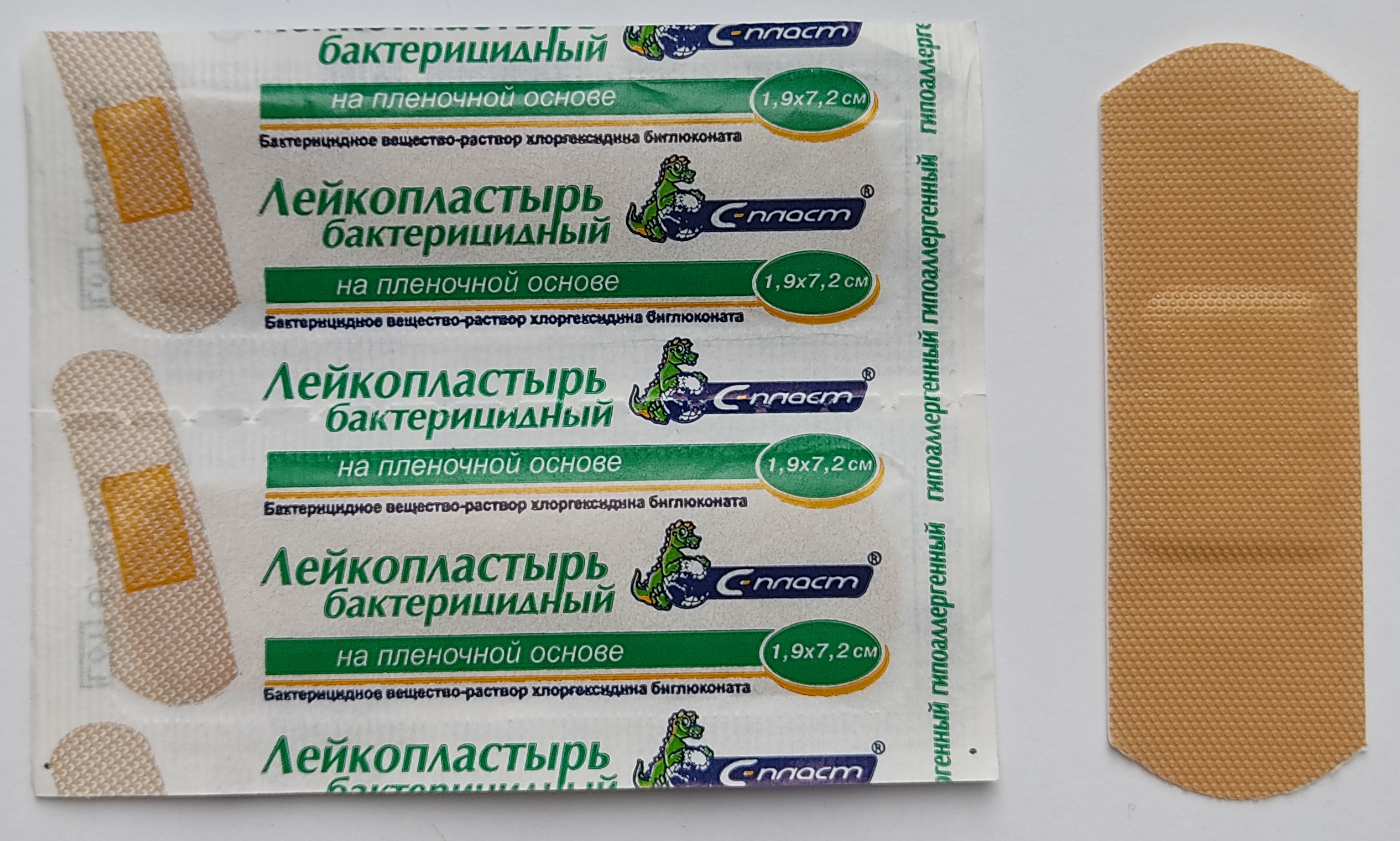 Лейкопластырь на основе микроперфорированной полимерной пленки телесного цвета . С внутренней стороны расположена раневая подушечка, пропитанная антисептичесим веществом - раствором хлоргексидина биглюконата, который оказывает обеззараживающее действие при соприкосновении с раной.