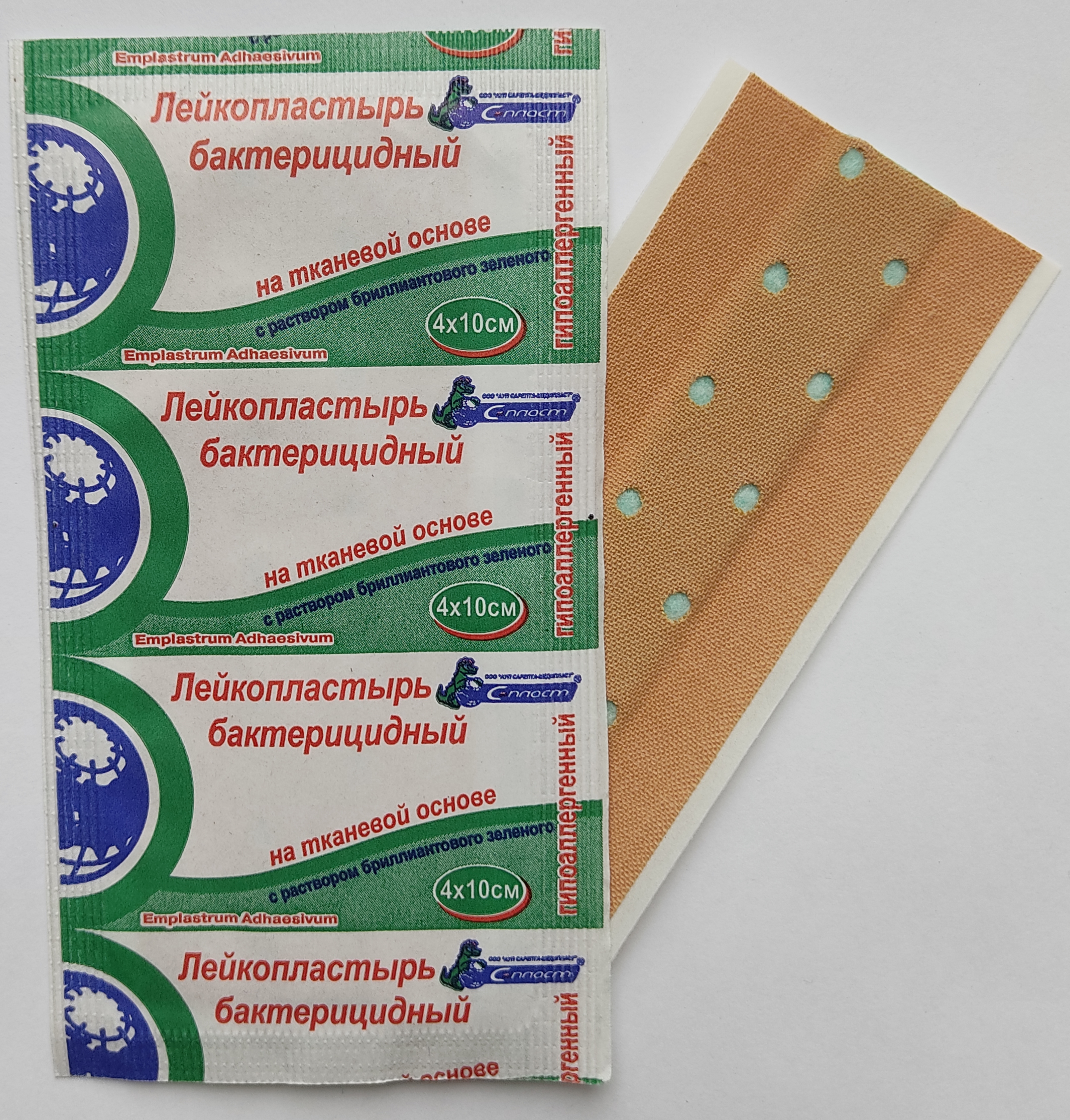 Лейкопластырь на основе х/б ткани. Раневая подушечка пропитана антисептическим раствором бриллиантового зеленого, который оказывает обеззараживающее действие при соприкосновении с раной.